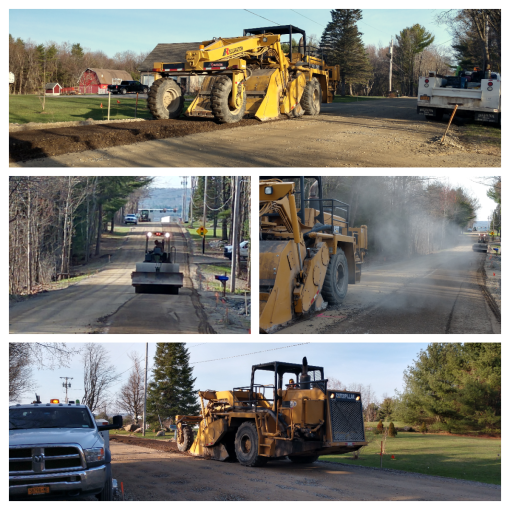 On Wednesday, May 2nd we brought in a milling machine from Peckham which allowed us to grind up the old blacktop while mixing in gravel to lay down a base for the new road. This along with other preparations will be leading up to the paving of Dean Lung on May 15th. Once the road has been paved the crew will come back with shoulder stone to install the shoulders and fill in the driveways so they tie back into the pavement.